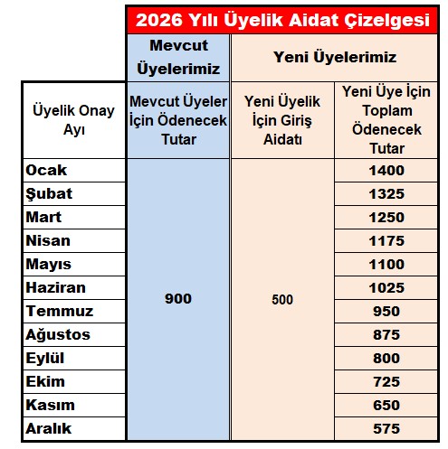 Üye olunan ilk yıl, yılsonuna kadar sürenin tam yıla oranı miktarında yıllık aidat ödemesi yapılır. İlk dönem aidatı, üyeliğe kabul tarihindeki aybaşı esas alınarak hesaplanır. Mevcut üye yıllık aidatları (ödentisi) ilgili yılın OCAK ayında gerçekleştirilmektedir. Örnek olarak 2026 yılı temmuz ayında üyeliği onaylanan bir üyemiz yıllık aidat olarak 450 TL (yılın kalan 6 ayı için 6 * 75=450TL) ve üyelik giriş aidatı olarak 500 TL olmak üzere toplam 950 TL ödeme gerçekleştirecektir.